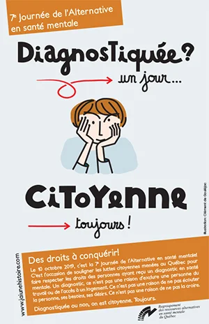 En 2019, la 7e Journée de l’Alternative en santé mentale s’est vécu sous le thème des droits et de la citoyenneté des personnes! Deux slogans-phare sont au coeur de notre campagne: ““Fou”? Selon toi! Citoyen, selon la loi” ainsi que “Diagnostiquée? Un jour… Citoyenne toujours!”. Ces slogans, élaborées par le comité Mobilisation du RRASMQ, vise à sensibiliser au respect des droits et de la pleine citoyenneté des personnes qui vivent avec un diagnostic en santé mentale. Restez à l’affut de nos rassemblements!